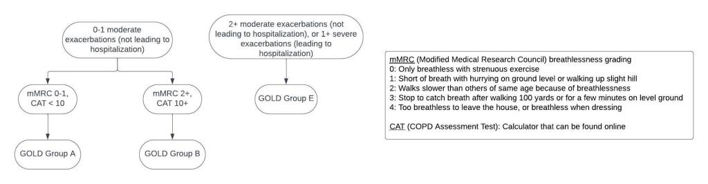 - Pharmacologic management is based on the patient’s Global Initiative for Chronic Obstructive Lung Disease (GOLD) classification. Examples of medications provided below (2)